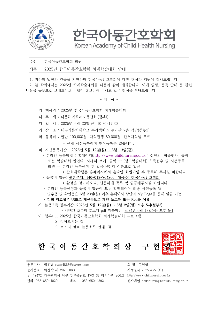 가. 행 사 명: 2025년 한국아동간호학회 하계학술대회 나. 주 제: 다문화 가족과 아동간호 다. 일 시 : 2025년 6월 20일(금) 10:30~ 17:30 라. 장 소 : 대구가톨릭대학교 루가캠퍼스 루가관 7층 강당 마. 등 록 비 : 일반 100,000원, 대학원생 80,000원, 간호대학생 무료 (전체 사전등록이며 현장등록은 없습니다) (간호대학생은 선착순 100명만 등록을 받음) 바. 사전등록기간 : 2025년 5월 12일(월) ~ 6월 13일(금) - 온라인 등록방법 : 홈페이지 (https://childnursing.or.kr/bbs/?code=workshop)에서 온라인 사전등록 후 입금(신청자 이름으로 입금) - 등록비 입금 : 신한은행. 140-013-704260 예금주 : 한국아동간호학회