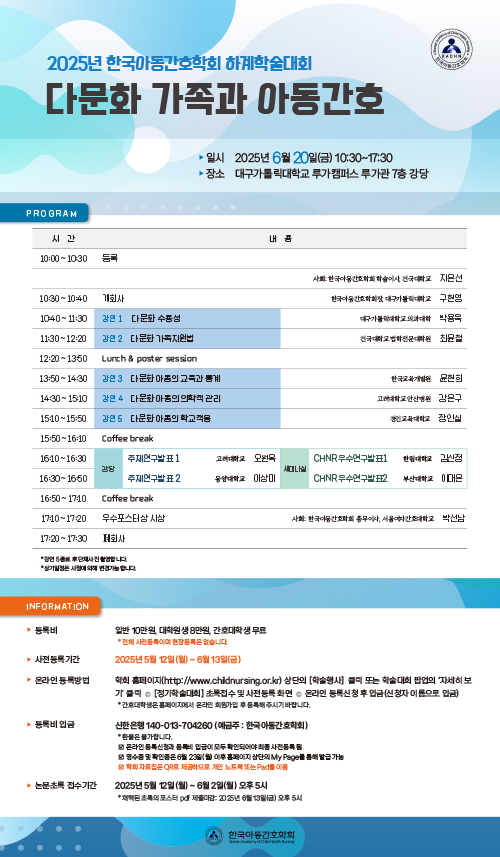 가. 행 사 명: 2025년 한국아동간호학회 하계학술대회 나. 주 제: 다문화 가족과 아동간호 다. 일 시 : 2025년 6월 20일(금) 10:30~ 17:30 라. 장 소 : 대구가톨릭대학교 루가캠퍼스 루가관 7층 강당 마. 등 록 비 : 일반 100,000원, 대학원생 80,000원, 간호대학생 무료 (전체 사전등록이며 현장등록은 없습니다) (간호대학생은 선착순 100명만 등록을 받음) 바. 사전등록기간 : 2025년 5월 12일(월) ~ 6월 13일(금) - 온라인 등록방법 : 홈페이지 (https://childnursing.or.kr/bbs/?code=workshop)에서 온라인 사전등록 후 입금(신청자 이름으로 입금) - 등록비 입금 : 신한은행. 140-013-704260 예금주 : 한국아동간호학회